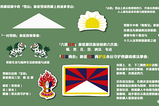 西藏国旗中的「雪山」象征雪域西藏;「一对雪狮」象征政教事业;雪狮托起的「宝焰」象征佛教三宝;雪狮手中的「如意宝」象征以佛法为基础的法律道德;「红蓝两色」象征红黑两护法永远守护西藏和佛法事业;「六道光」象征西藏民族初始的六氏族;「太阳」象征政教事业兴旺发达。